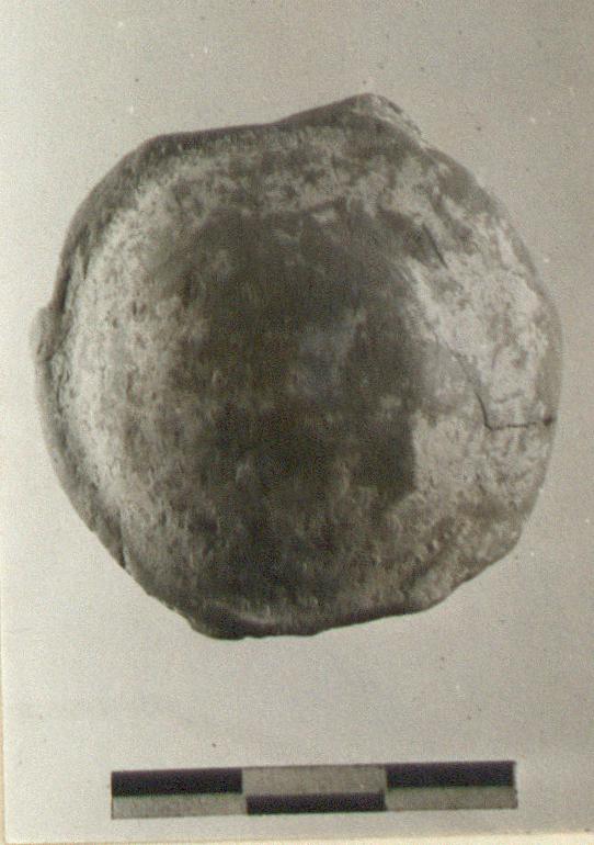 | Description: | A round shield, covered with white slip and cream paint, broken off from left side of a figure of which a tiny bit is preserved. Sharp cuts and fabric as preceding T 3171 (EE 561) white slip has washed over, inside. Probably from soldier (?). Cf. T 3171. Cf. Hesperia 43 (1974). | |