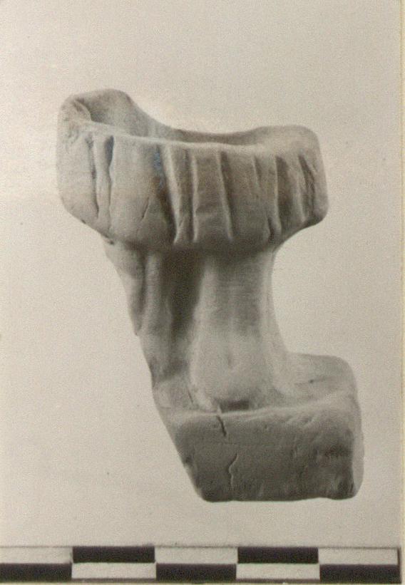 | Description: | Lower part of draped figure wearing a garment hanging in straight folds to well above the ankles, and high boots laced up the front. Rectangular base. Perhaps Artemis (?). A few traces of white. Pinkish clay. ADDENDA 1953, DBT: This fragment was originally numbered T 2074 b; but was later determined not to belong. | |