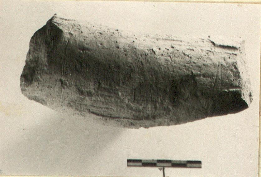 | Description: | Fragment of arm or leg. Broken all around. Smooth finished vertical groove, for wooden support possibly, runs full length of back surface. Note incised lines on surface. Coarse yellow clay; the smoother surface now worn. Cf. T 3297 (T 2466) and others. | |