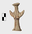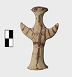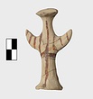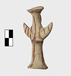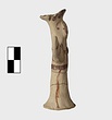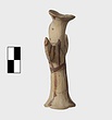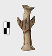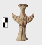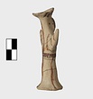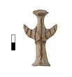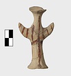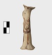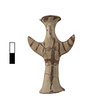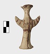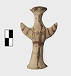 | Description: | Standing female figure; upraised arms covered by wing-sleeves. Flaring headdress, concave on top; shirt flares to form base of figure, concave beneath. Pellet breasts. Mended from several pieces, complete. Stripped decoration in reddish-brown glaze. Buff clay. | |