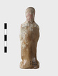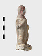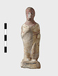 | Description: | Mended from two pieces. Male figure closely wrapped in a cloak which covers the arms. Heavy white paint on base and cloak, with horizontal red stripes and black stripe on base. Feet and face red; black on hair and eyes. Very little modelling. Brown clay. | |