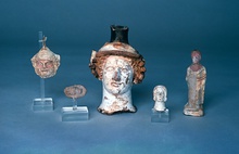 | Description: | Head wearing kerchief and earrings. Nose chipped. Finished surface at bottom of neck for attachment. White paint well preserved. Red on hair at sides and at top. Traces of green on disk earrings. Eyes and eyebrows outlined in black. Brownish-buff clay. | |
