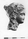 | Description: | Large female head, inclined slightly to its right, wearing hair in knot at crown and in curls down neck, fillet; stephane broken from top. Squinting eyes, dimple in chin, long neck. Remains of white and of red over the white. Pinkish-buff clay. | |