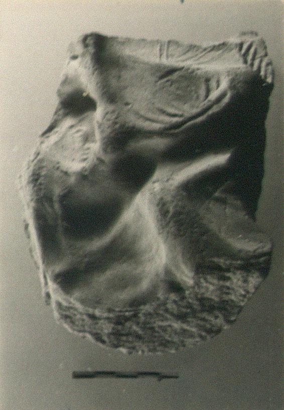 | Description: | Upper part of nude apobates seen facing, his head turned towards proper right. His right arm is outstretched passing in front of the figure of the charioteer; chiton with short sleeves; arms outstretched. Broken all around. Buff slip on mold surface. Heavy mold of pinkish clay with many red bits. | |