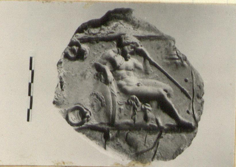 | Description: | The impression was taken from a relief worked in repousse on a plaque 0.073m. high and 0.105m. long. Intact, except for minor chips. Toward the left end were rivets (two out of an original three) for fastening the plaque to a backing; toward the right two loose rings. A bearded and long-haired warrior sits disconsolate to left on his cloak spread on a rock, spear in hand, shield with prominent Gorgoneion by his side; helmet in field. Perhaps Philoktetes (?). Fine buff clay. | |