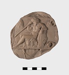 | Description: | The impression was taken from a relief worked in repousse on a plaque 0.073m. high and 0.105m. long. Intact, except for minor chips. Toward the left end were rivets (two out of an original three) for fastening the plaque to a backing; toward the right two loose rings. A bearded and long-haired warrior sits disconsolate to left on his cloak spread on a rock, spear in hand, shield with prominent Gorgoneion by his side; helmet in field. Perhaps Philoktetes (?). Fine buff clay. | |