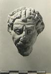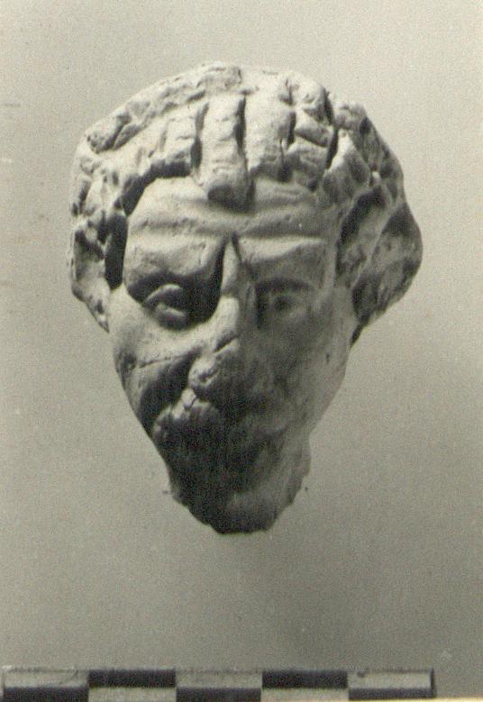 | Description: | Head of a man with beetling brows and a moustache. Mouth open. Hair at back indicated only in part, and with rough cross-grooving. Broken off across neck; chin chipped. Solid. At the back is attached an irregular piece of clay, as if for a sort of handle; stump only preserved. No color. Pink to buff clay. | |