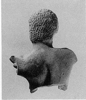 | Description: | Fragment from back (upper torso and head) of a male figure. Vigorous modelling; hair rendered by stippling. No trace of paint or engobe. Reddish clay. | |