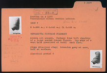 | Description: | Perhaps from left shoulder of a large seated draped figure. Top edge of a vent hole preserved at back. Back flat; broken all around. Classical period, about 470 B. C. (?). Clean micaceous clay; brownish-gray at core, buff at surface. | |