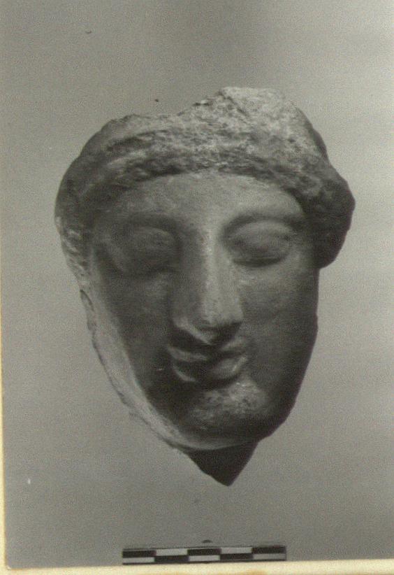 | Description: | Fragment a), face and part of hair preserved. About half life size. Tight curls around face. Fragment b), another fragment preserves part of the top and back of the head with finished edge, and the left ear; earrings. Surface rubbed in washing. No white preserved. | |