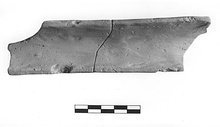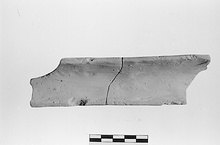 | Description: | A small roughly semicylindrical object, finished along both edges. Broken at both edges. Traces of white engobe. Support or reinforcement for large scale terracotta figurine (?). Miniature cover tile (?). Rather soft clay, buff to pink with gray core. | |