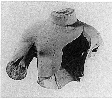 | Description: | Two joining fragments preserve most of torso, part of one arm and beginning of the other. Also lower part of neck. Large fragment missing from front left. Buff, well-baked clay. | |
