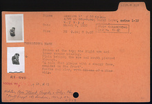 | Description: | "A thin flat plaque with a snaggy face, moulded on the front". Broken at the top; the right eye and lower corner missing. Plain behind; the eye and mouth pierced through. Coarse red clay. | |
