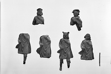 | Description: | Preserved above waist except right arm. Two joining body fragments; head reattached. Similar to T 3806 and from same or related mould. Hat similar to T 3806. Head turned to left. Traces of white and red paint. Buff clay. | |