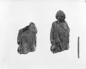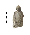 | Description: | Missing are both legs. Head mended from two pieces and reattached. Chips missing from head. Moulded, head and legs separately. Body hollow. Back unmodelled. Figure standing with left arm crooked at left side and right arm hanging down at right side. Dressed in clamys fastened with button on right shoulder, wrapped around both arms. Hair in curls hanging nearly to shoulders. Traces of red and white. Buff clay. ADDENDA Damaged February 1972: broken into several pieces and subsequently mended. Missing are chips from left hand and from head. | |