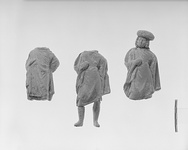 | Description: | Head and legs missing. Moulded head and legs separately. Figure with left arm akimbo and right arm crooked. Dressed in chlamys fastened on right shoulder. Chlamys is wrapped around left arm. Undergarment protrudes beneath chlamys hemline. Left leg advanced. Traces of white paint. Buff clay. | |