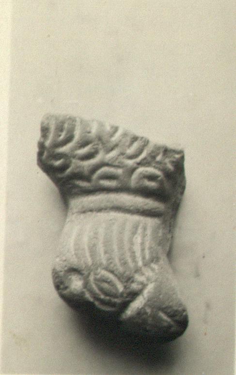 | Description: | One side of the head and the shoulder preserved. Fur indicated by deep gouges. Moulded, solid, the back finished smooth. White slip, red for collar. Coarse red clay. Cf. T 383 and T 2185. | |