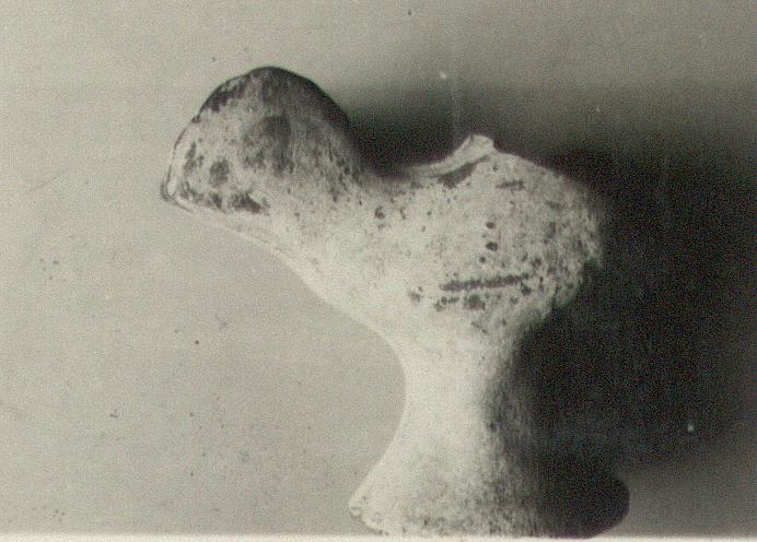 | Description: | Head missing. A high faring base instead of feet. Mould-made, in two pieces with a vertical join. Heavy chalky white slip and traces of added red. Brick red clay. | |