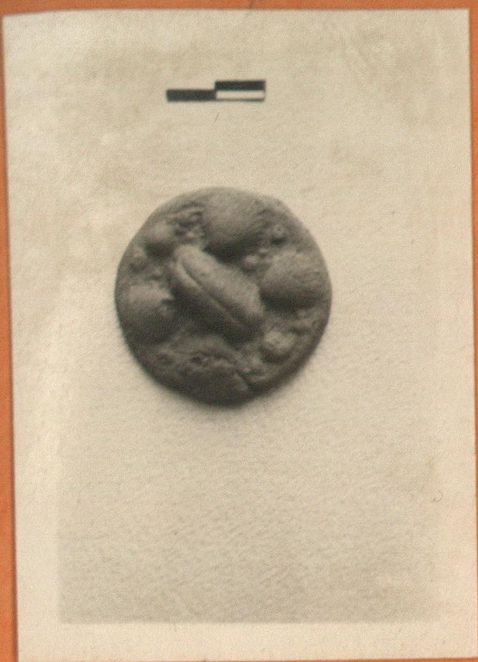 | Description: | Disk with four appliqué seashells around a semicircular projection. Between the shells are small lumps of clay, smaller shells (?). Unglazed. Buff clay. Possibly a small lid, the projection serving as handle. Cf. Pottier and Reinach (1887), Nécropole de Myrina, pp. 245-246. | |