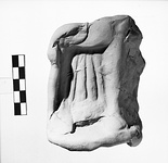 | Description: | Broken all around. A bit of lower surface preserved. Mold for lower legs and feet of heavily draped figure with feet protruding from drapery. Orange clay. Cf. T 4041, T 4042, T 4047, T 4048, T 4049. Cf. T 2002 for general type, not identical. ADDENDA Seated goddess; for mold for weak derivative of same series from the same context, see MC 1226. | |
