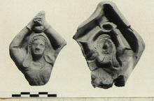 | Description: | Upper part of mold preserved. Mold for frontal female figure hands elapsed together and held over head. Figure wears garment with long sleeves and head dress which falls to shoulders. Smooth exterior. Fabric yellowish-pink turning slightly gray towards center. ADDENDA Joins with T 4072 and T 4073. | |