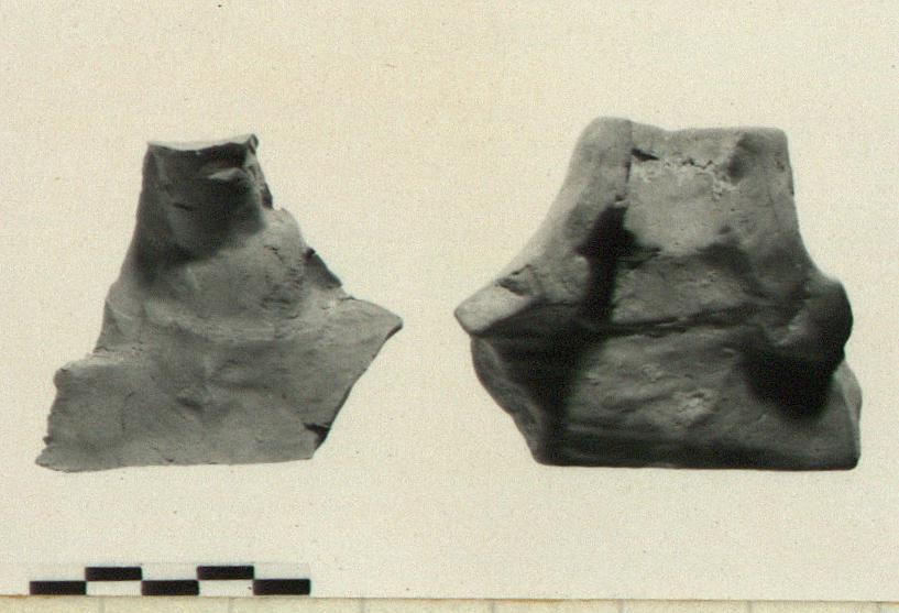 | Description: | Parts of all sides seem to be preserved and front and back. Parts of two corners missing. Mold for a triangular-shaped object, subject not clear. Smoothed back. Fabric pinkish-yelow with gray core. Cf. T 4083, and T 4152. ADDENDA Deity (?) by a column. Preserved part of a column on an indistinct base. The imprecision may be partly due to drapery hanging down over plinth. | |
