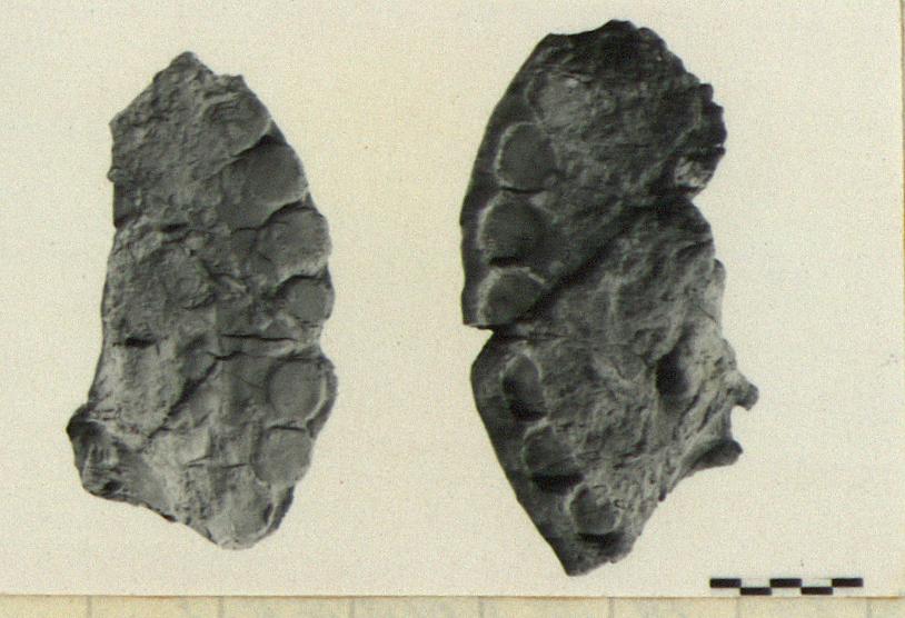 Along circumference of mold series of 7 circles roughly 0.025m. in diameter preserved. Off center to the circumference there is a raised projection where moulded object rose up out of the level of the circles.