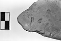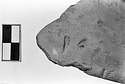 | Description: | One side, front and back preserved. Most of front surface gone. Subject of mold uncertain. Seem to have series of semi-circles along preserved edge with striations within the circles, possibly forming a circular base with preserved edge being bottom of mould. Back roughly smoothed. Inscribed on buff back while clay still moist. Fabric: orange core with buff-yellow surface. ADDENDA Part of the head of a protome. Joins with T 4088. | |