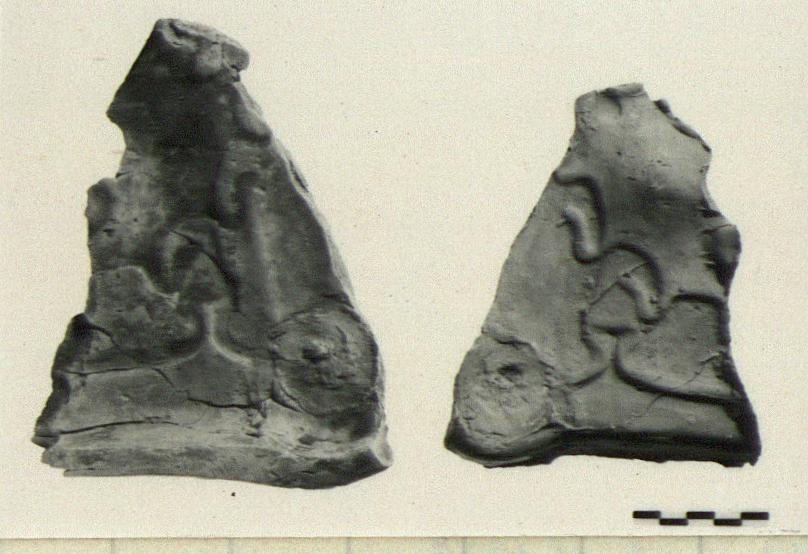 | Description: | Broken on three sides. One side, front, back preserved. Subject uncertain, possibly aegis with part of Gorgoneion of Athena. Back roughly smoothed. Fabric pinkish-yellow with gray core. ADDENDA RVN: Mold for protome of Athena. Joins with T 4099, T 4102 and T 4116. | |