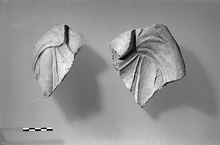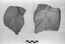 | Description: | Broken on three sides. One side, front, back preserved. Small part of front surface missing. Subject appear to be upper left arm, shoulder and small part of torso from draped female figure, with drapery continuing upward presumably to cover head. Back roughly smoothed. Fabric: hard baked household ware. ADDENDA RVN: Mold for large protome of veiled goddess. See also T 4081, T 4086, T 4103: apparently the same series, but one generation later. | |