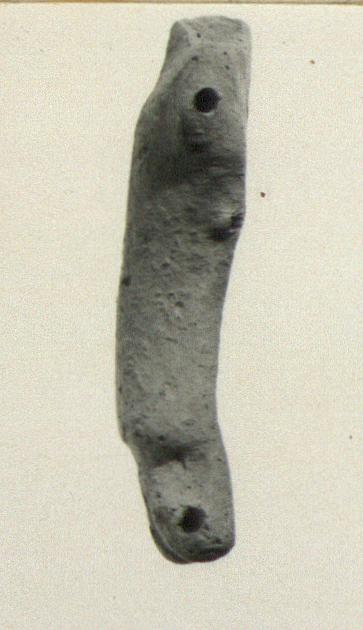 | Description: | Broken at neck; one of bottom hinges missing. Segmented doll of which torso preserved. Horizontal hole through shoulder for attachment of arms. Three projections at bottom of torso (one now missing), pierced horizontally for attachment of legs. Back very flat and slightly concave; front barely articulated. Buff fabric. Cf. T 2224. ADDENDA RVN: Attic derivative from Corinthian. Articulated dancer. | |