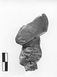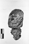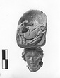 Traces of white paint on the face, red on the hair and pad. Pierced in small hole beneath.