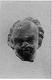 | Description: | Forepart of head (of Satyr ?). Broken away behind and at the neck. The front locks of the hair, part of the neck and the left ear are preserved. Man with bald or shaved forehead and spreading shock of hair above. Face with puffy eyes and mouth. Dark gray glaze over the right side of the face (?). Buff clay. | |