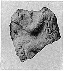 | Description: | Male figure riding to left. None of the original surface is preserved. The head of the figure and the lower part of his body except for his left knee are missing. Preserved: his left, raised arm, his torso either clothed in a tucked cloak or provided with drooping wings, his left knee, and the mane of the animal he is riding (a lion ?). Thin red glaze on inside and out. A small hole to the right of the waist of the figure is glazed, and may have been a filling or an air hole. Red clay. The fragment may have formed, possibly, part of a lamp. | |