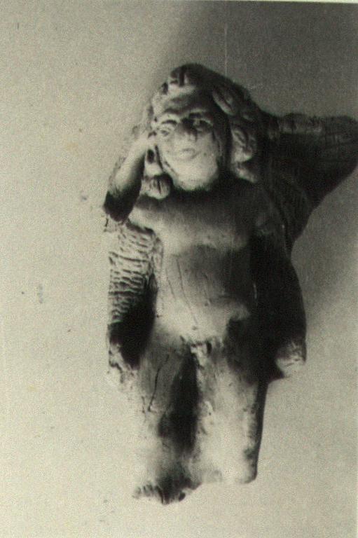 | Description: | Missing the right wing, and the feet. Incised feathers on wings and arms. Traces of color: red on flesh, yellowish brown on hair, white on arms and wings. ADDENDA: Incised boxer 's glooves on arms (?) | |