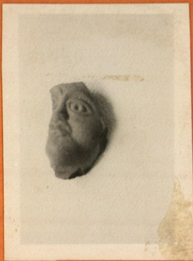 | Description: | The left side of the head is preserved, broken all round. The features are heavy, the cheeks and chin bulging; the mouth is bent down at the corner. Coarse work. Mold made; hollow. Not colored. Red clay. | |