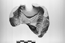 | Description: | The mold is for the upper part of a draped female figure. Broken off just above the waist. The figure was wearing a chiton girted high, and had folds of drapery over the arms. There are two sets of sleeves. Incised on the outside of the mold with the letters: Δ Η. Light red clay. Cf. T 122, T 145, T 1354, T 1915. <graphic> | |