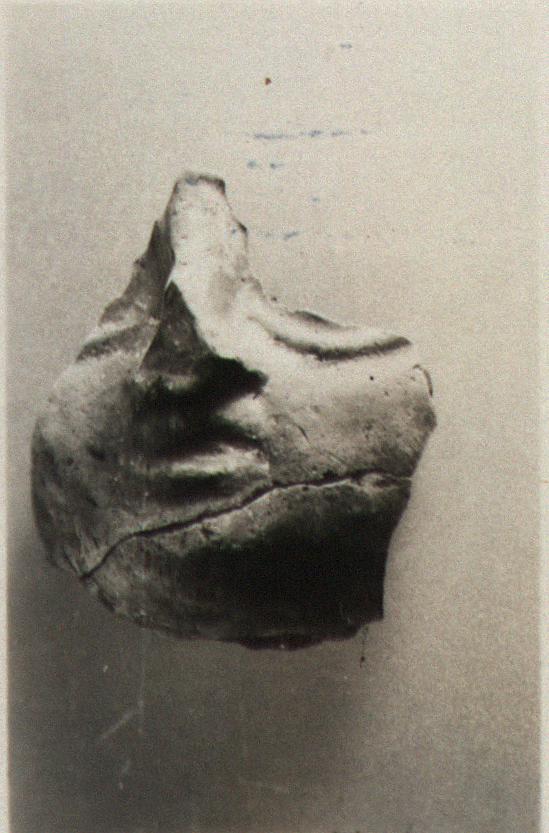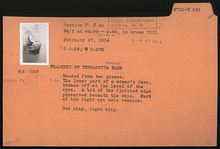 | Description: | Mended from two pieces. The lower part of the face, broken off at the level of the eyes. A bit of the finished edge preserved beneath the chin. Part of the right eye hole remains. Light slip. Red clay. | |