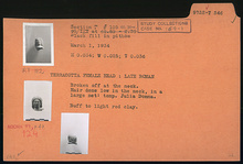 | Description: | Broken off at the neck. Hair done low in the neck, in a large net: temp. Julia Domna. Buff to light red clay. Late Roman. | |