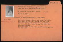| Description: | Part of a woman 's face, the upper left side with part of the left cheek and the left eye preserved, and elaborately rendered hair. A finished edge along the side; the eye hole large. Red clay with white slip, and brownish yellow on the hair. Late Roman. | |