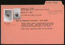 | Description: | Crude head, considerably battered; broken at neck. The hair is done in an elaborately braided mass at the back. Made in two pieces. Unglazed. Buff clay. Late Roman. | |