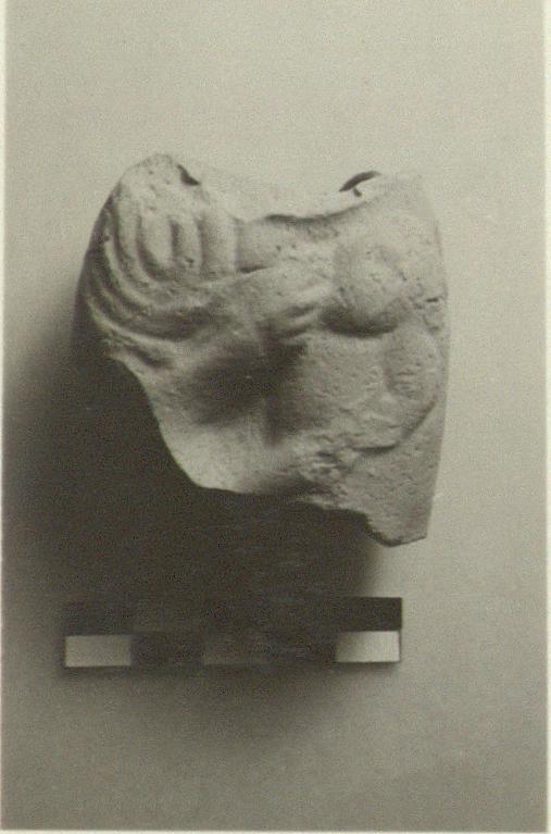 | Description: | Preserved is only part of the woman 's upper body, with her right arm reaching across to the child who seems to be at her left breast. Mold made. Unglazed. Clay, buff to pink. | |