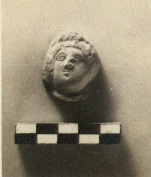 | Description: | Broken away behind and at neck. Over the hair, which shows at the front, a mantel (?) indicated by cross-hatching. The features crudely modelled. Traces of yellow paint over the hair. Micaceous red clay. Late Roman. | |
