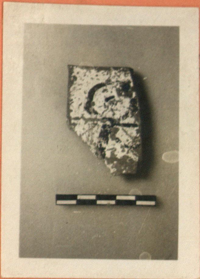 | Description: | Fragment of painted pinax. Broken to right and below. One hole near top for suspension. Painted in the white ground, in red, the leg and part of the bowl of a tripod; in orange, the loop handles over the leg, and fillets (?) hanging from it. A red object inside the handle. Fine pinkish buff clay. A second fragment, found 9 April 1935, joins to the right of the first, giving the complete width at the top. | |