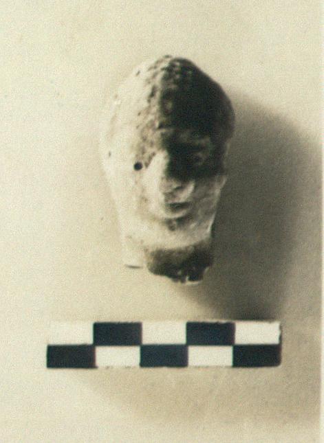 | Description: | Broken away behind and at neck. A man with close cropped hair, indicated by raised dots. Holes for pupils. Broad nose. Raised dots on neck. Dull red glaze. Micaceous orange clay. From a plastic lamp. Late Roman. Cf. T 676. | |