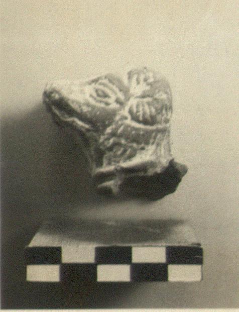 | Description: | Head of dog. Broken away at neck. Head made in two halves, imperfectly joined. Dull white paint. Yellow on collar. Late Roman. | |