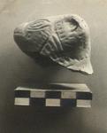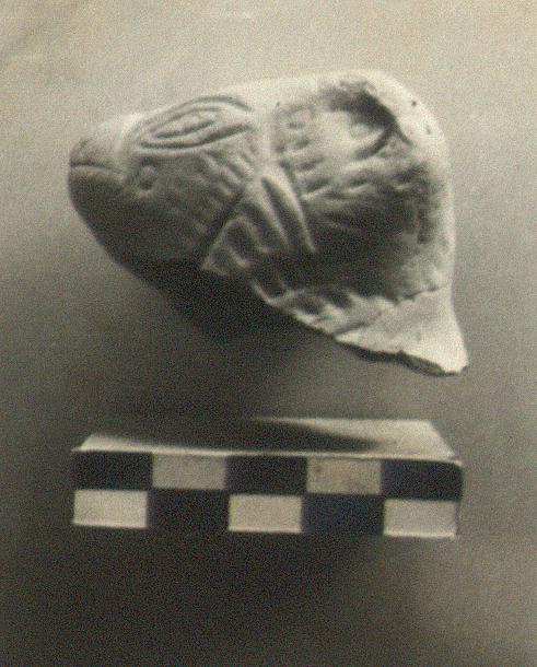 | Description: | Head of dog figurine. Two joining fragments. Broken away across lower part of head. Traces of white paint. Buff micaceous clay. Late Roman. | |