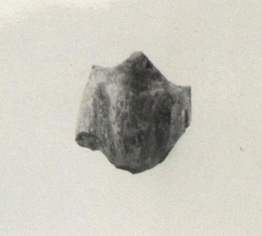 | Description: | Fragment of drapery from upper part of figurine. Top of fragment, above a sort of collar (horizontal depression with applied color), broken projection which seems to be part of chin. Across the expanse below, shallow grooves from either side converge slightly toward bottom of fragment; possibly to set off arms. Mold made; hollow. Remains of white which covered whole surface, and of overlying red (sides) and ochreous yellow ("collar") and center of "bosom". | |