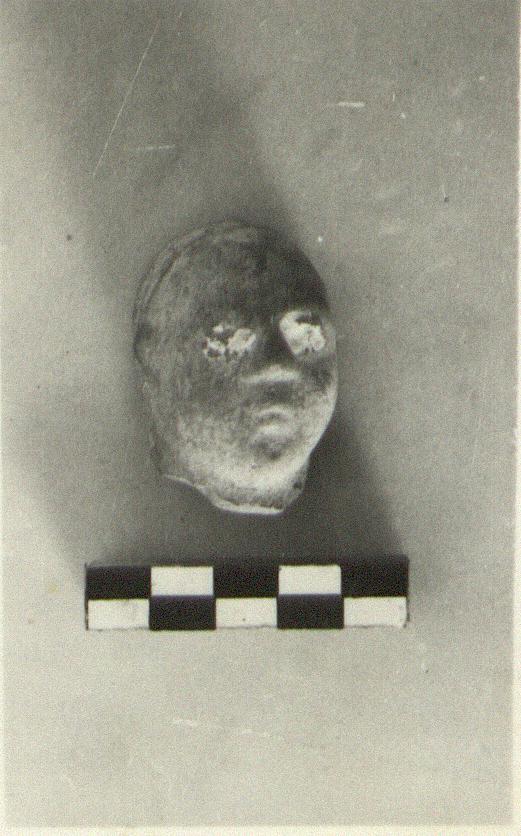 | Description: | First interpretation: head of man. Infant with shaven head. Broken away in back and below. Red paint preserved, and white in the eyes. Late Roman. | |