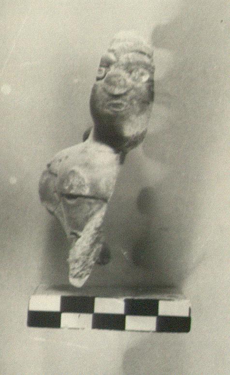 | Description: | Head broken away behind and a little on either side. Right half preserved; broken below. Grooves for eyebrows. White paint in eyes. Trace of red paint on top of head. Red micaceous clay. | |